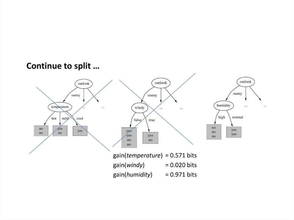 gain(outlook) = 0.940 - 0.693 = 0.247 bits of information.gain(temperature) = 0.029 bits