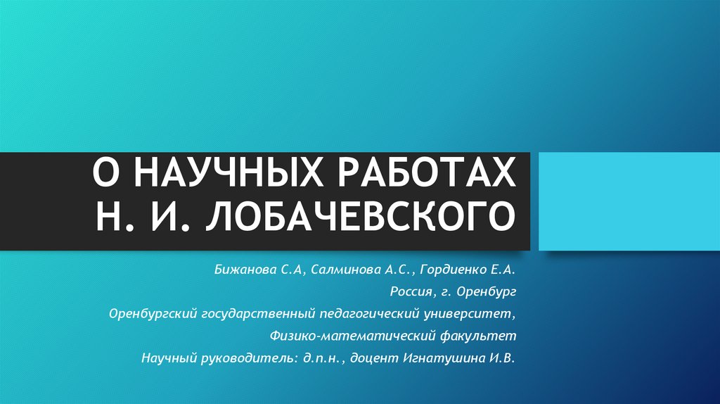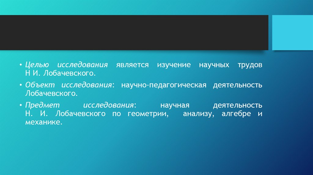 • Целью исследования является изучение научных трудовН И. Лобачевского.