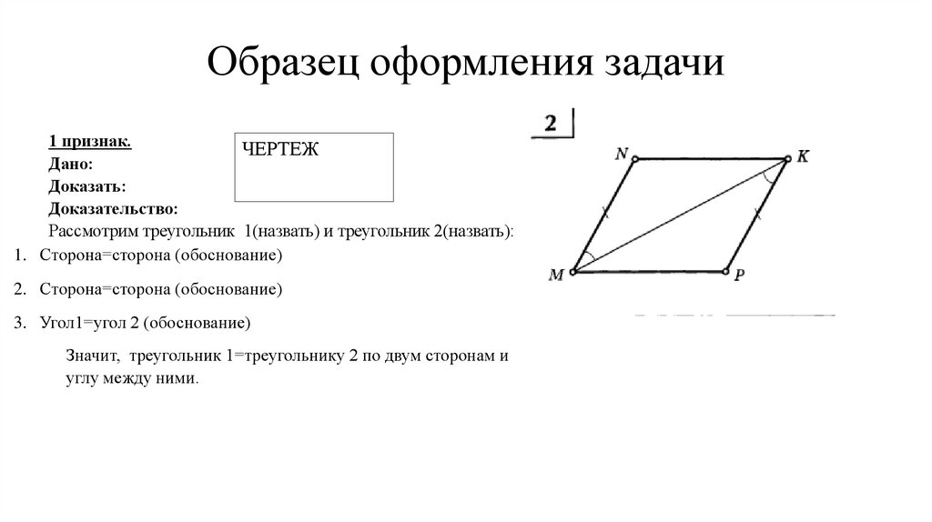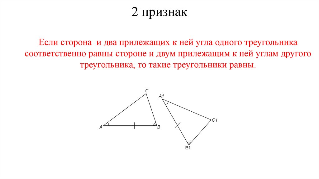 2 признакЕсли сторона и два прилежащих к ней угла одного треугольника
