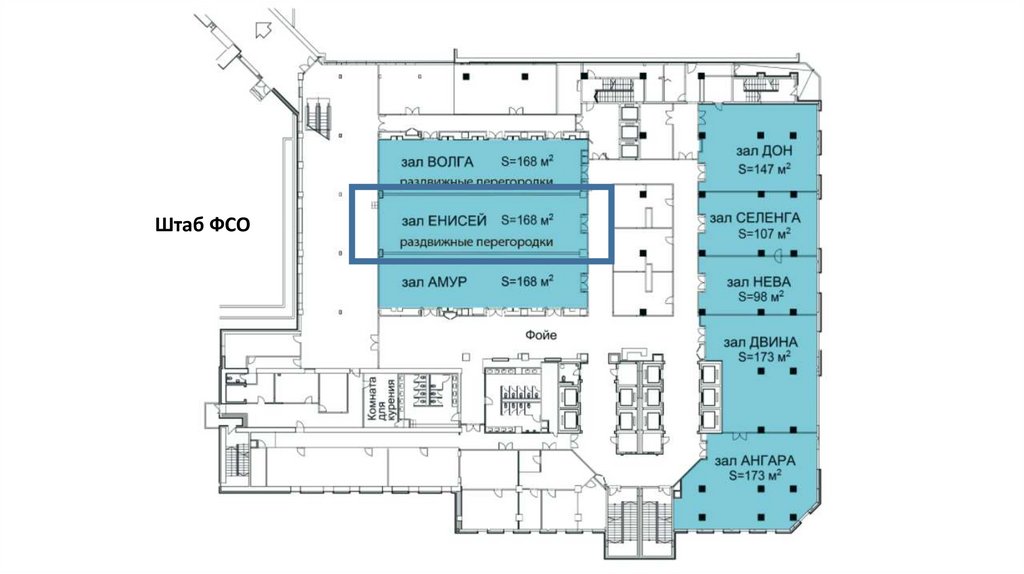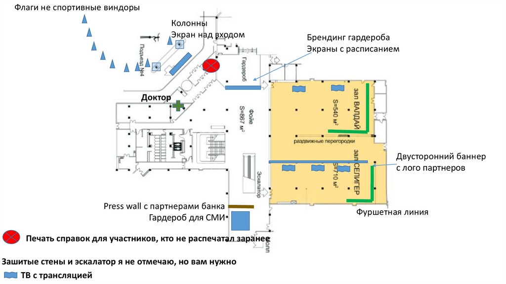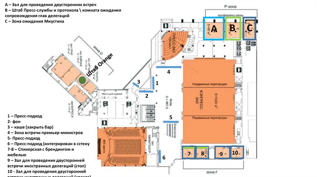 A – Зал для проведения двусторонних встречВ – Штаб Пресс-службы и протокола \ комната ожидания