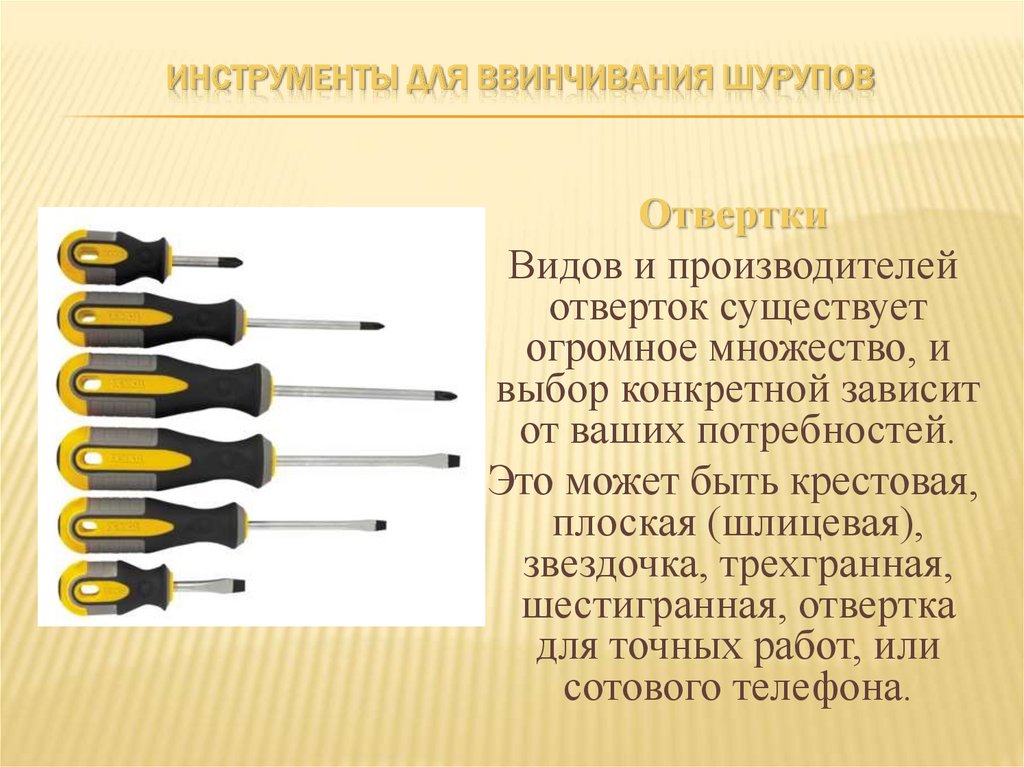 ИНСТРУМЕНТЫ ДЛЯ ВВИНЧИВАНИЯ ШУРУПОВОтвертки