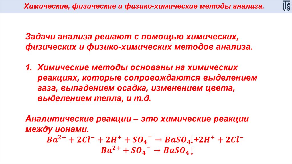 Химические, физические и физико-химические методы анализа.Задачи анализа решают с помощью химических,