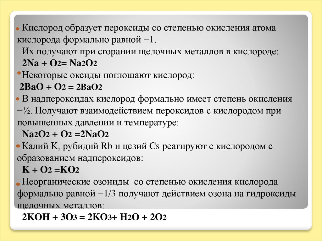 Кислород образует пероксиды со степенью окисления атомакислорода формально равной −1.