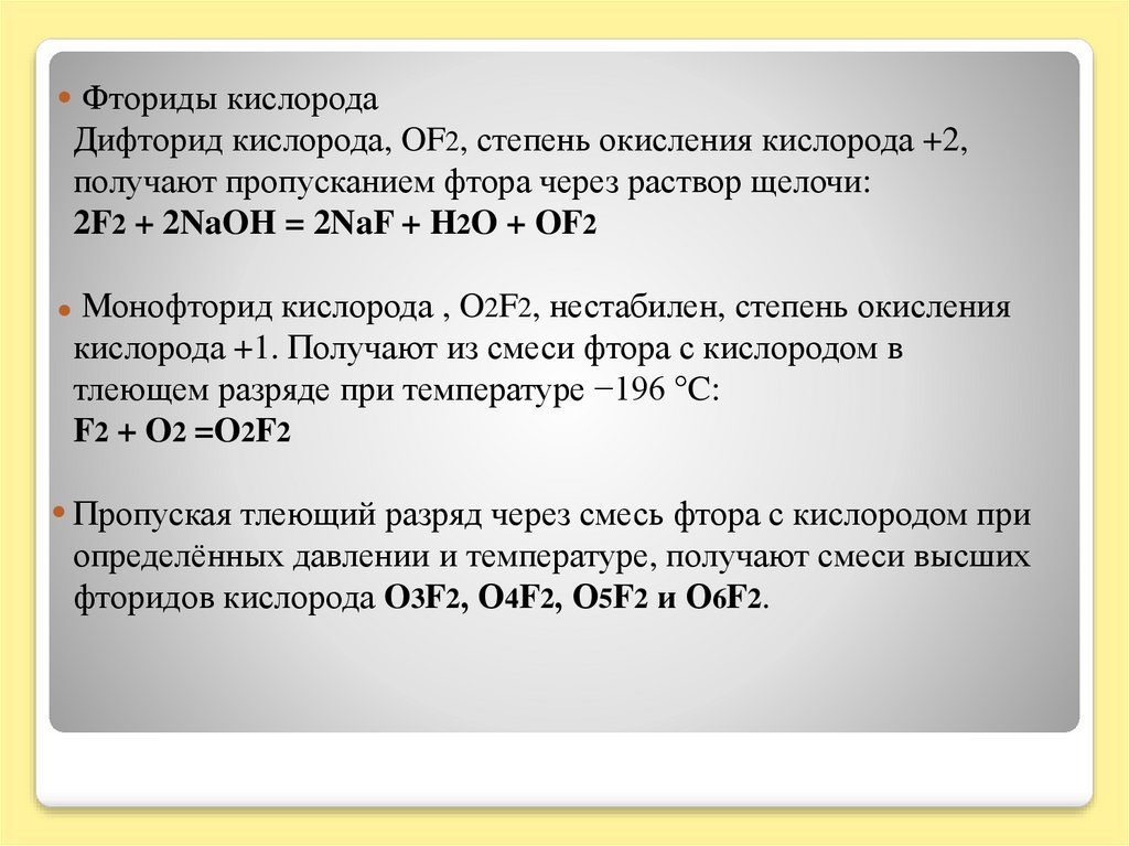 Фториды кислородаДифторид кислорода, OF2, степень окисления кислорода +2,