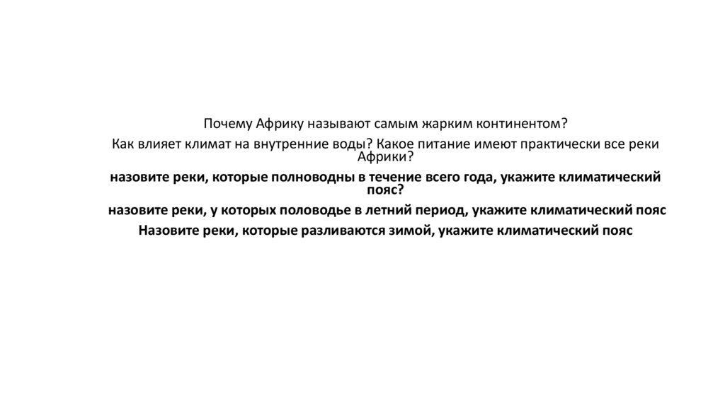 Почему Африку называют самым жарким континентом?Как влияет климат на внутренние воды? Какое питание имеют практически все реки