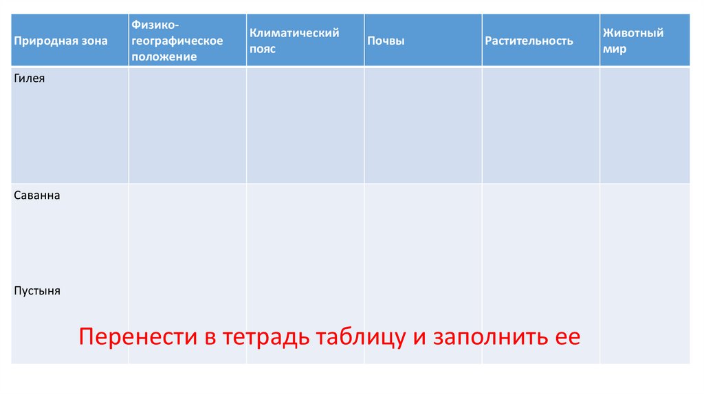 Перенести в тетрадь таблицу и заполнить ее