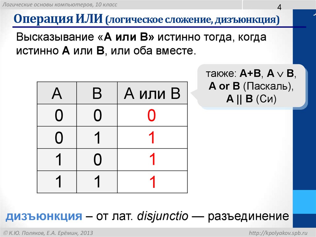 Высказывание «A или B» истинно тогда, когда
