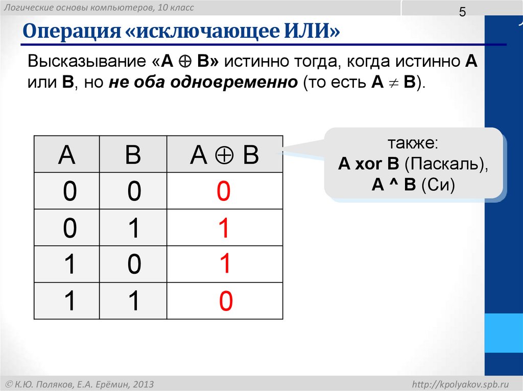 Логические основы компьютеров, 10 классОперация «исключающее ИЛИ»