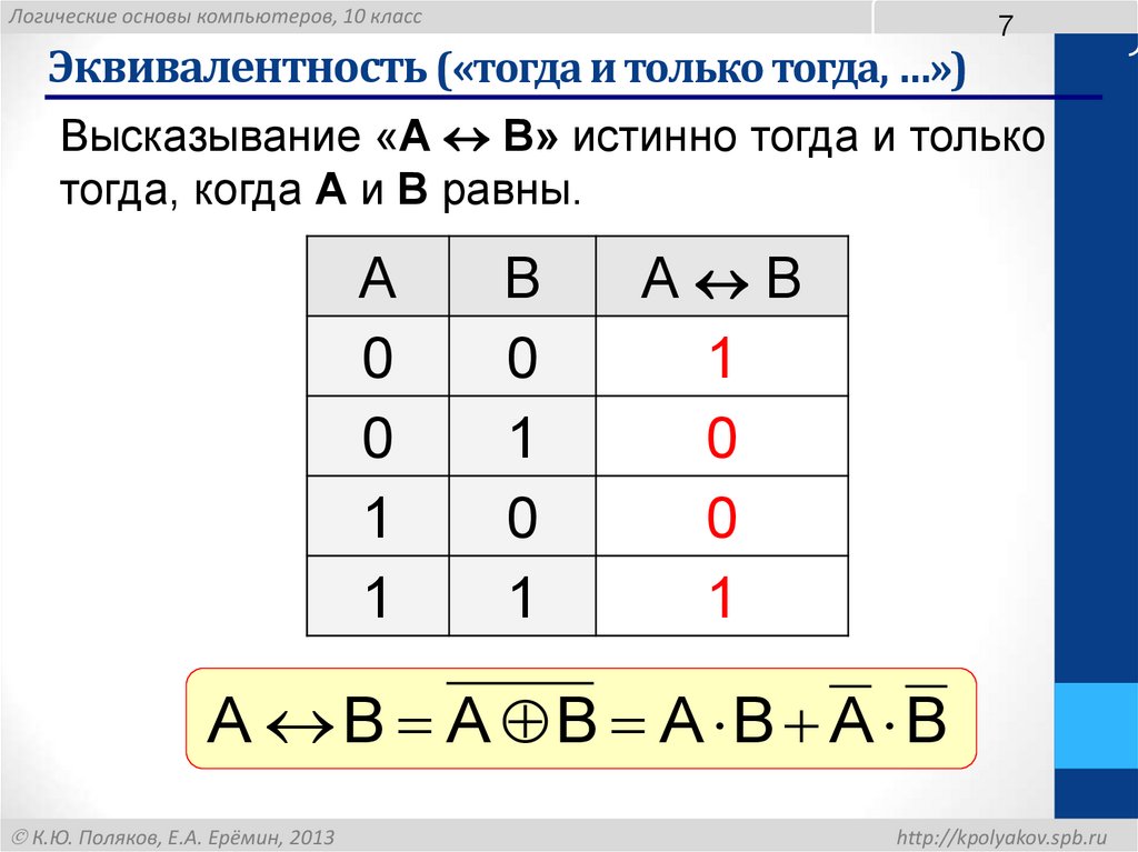 Логические основы компьютеров, 10 классЭквивалентность («тогда и только тогда, …»)