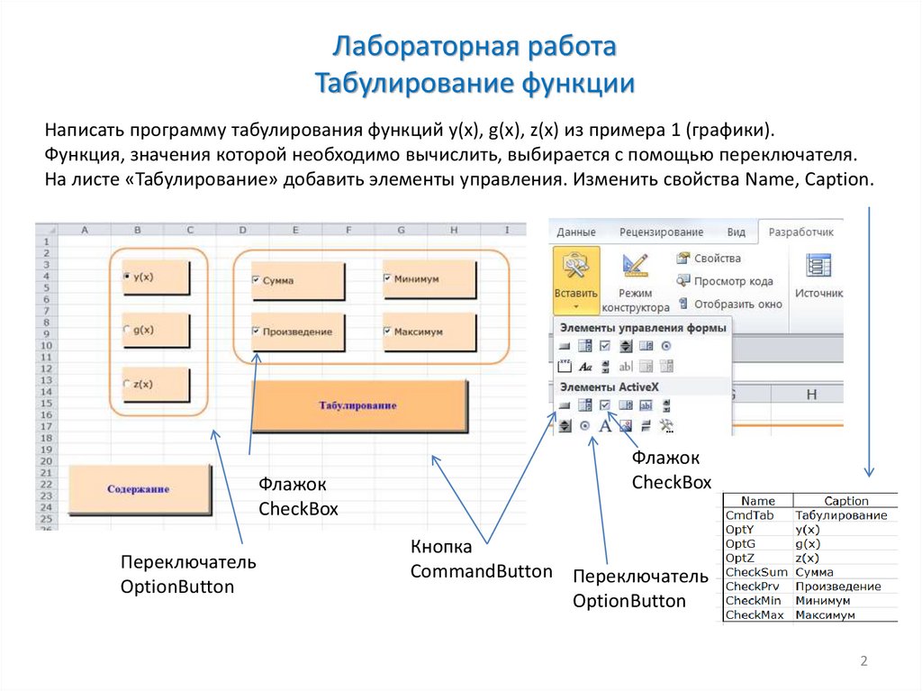 На листе «Табулирование» добавить элементы управления. Изменить свойства Name, Caption.