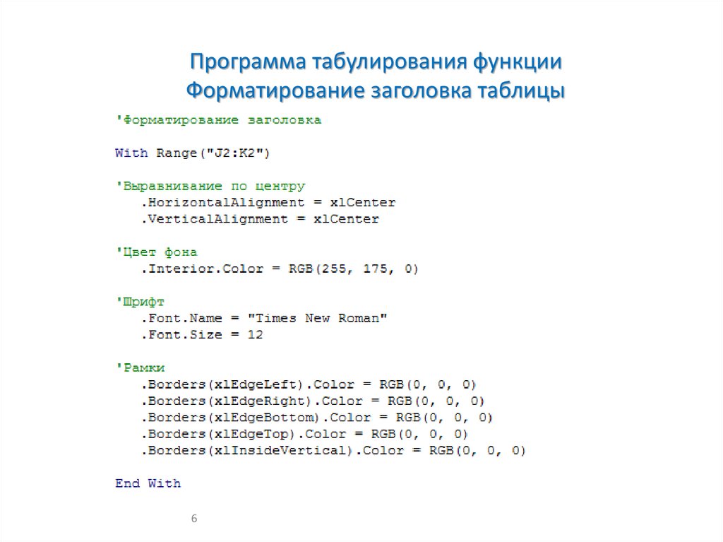 Программа табулирования функцииФорматирование заголовка таблицы