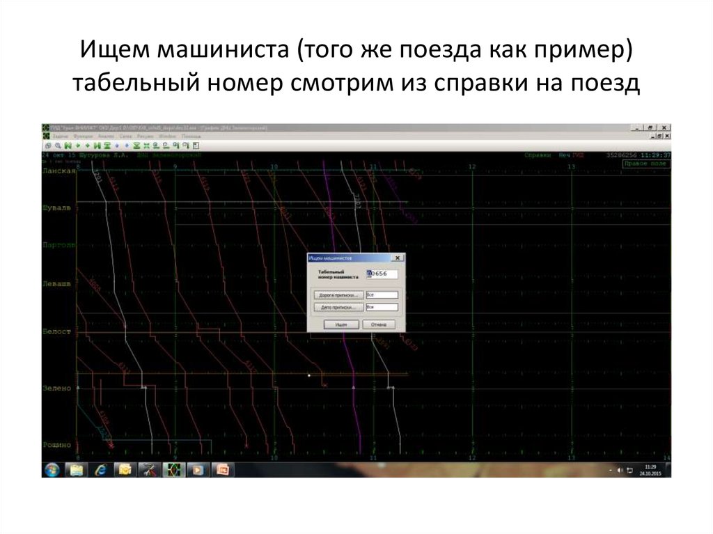 Ищем машиниста (того же поезда как пример)табельный номер смотрим из справки на поезд