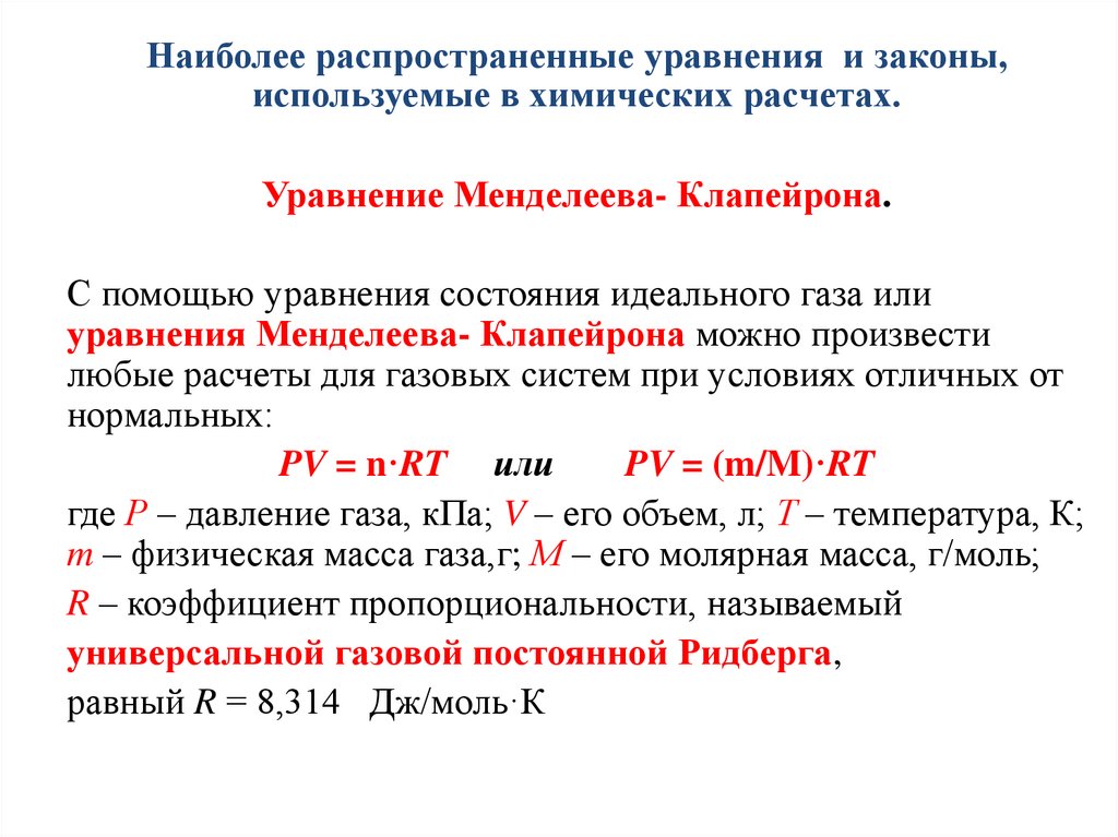 Наиболее распространенные уравнения и законы,используемые в химических расчетах.