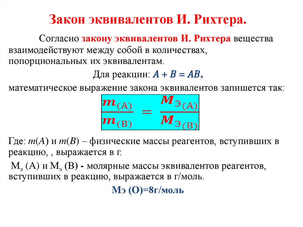 Закон эквивалентов И. Рихтера.Согласно закону эквивалентов И. Рихтера вещества