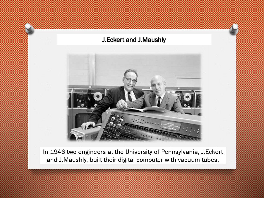 In 1946 two engineers at the University of Pennsylvania, J.Eckertand J.Maushly, built their digital computer with vacuum tubes.