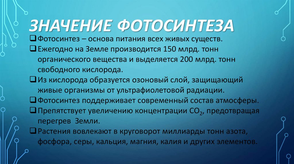 ЗНАЧЕНИЕ ФОТОСИНТЕЗАФотосинтез – основа питания всех живых существ.