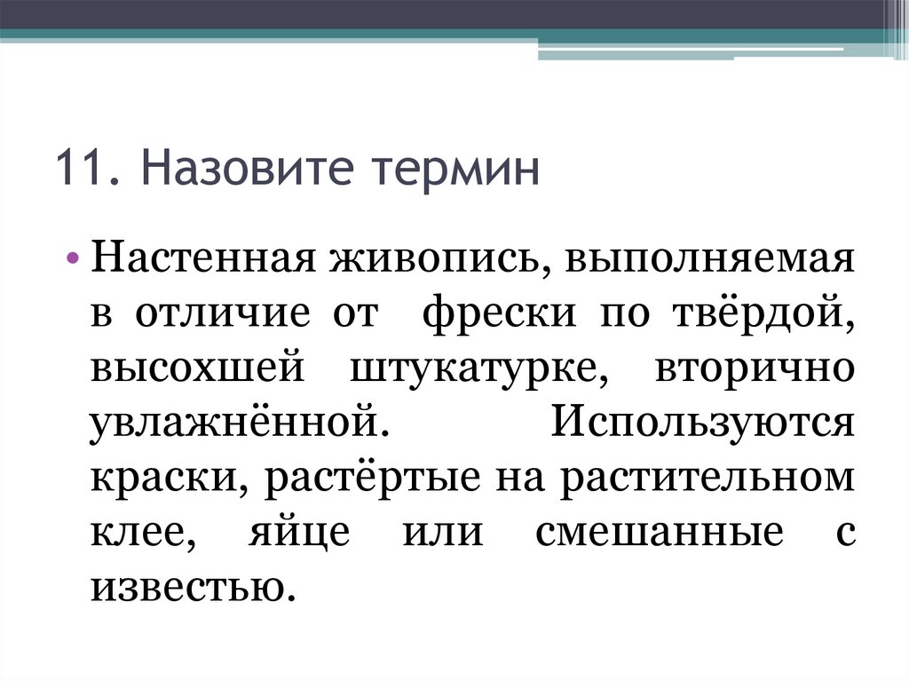 11. Назовите термин• Настенная живопись, выполняемая