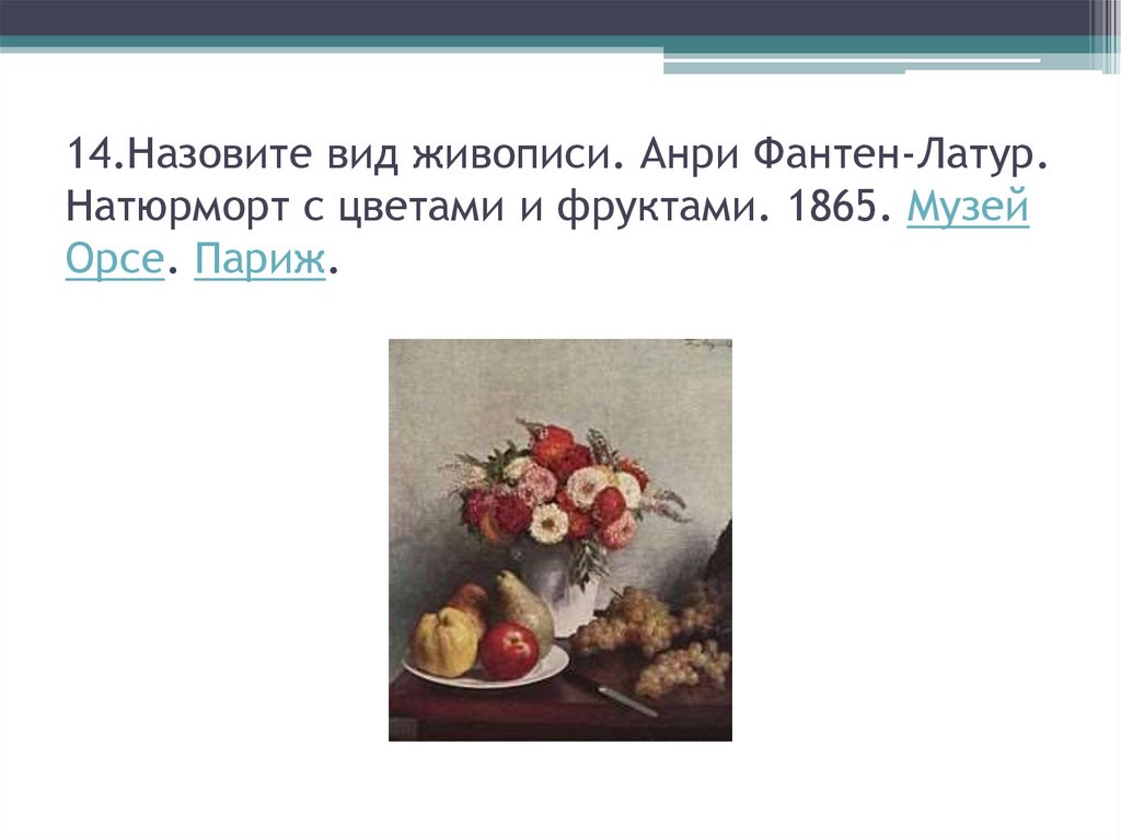 14.Назовите вид живописи. Анри Фантен-Латур.Натюрморт с цветами и фруктами. 1865. Музей