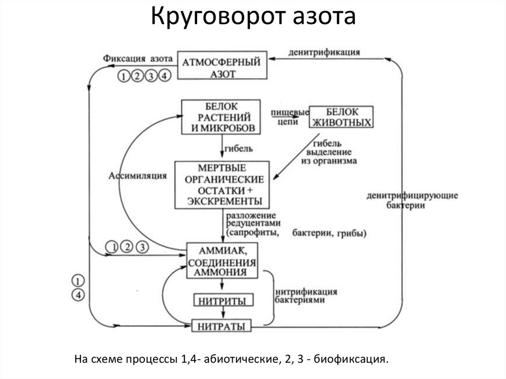 Круговорот азотаНа схеме процессы 1,4- абиотические, 2, 3 - биофиксация.
