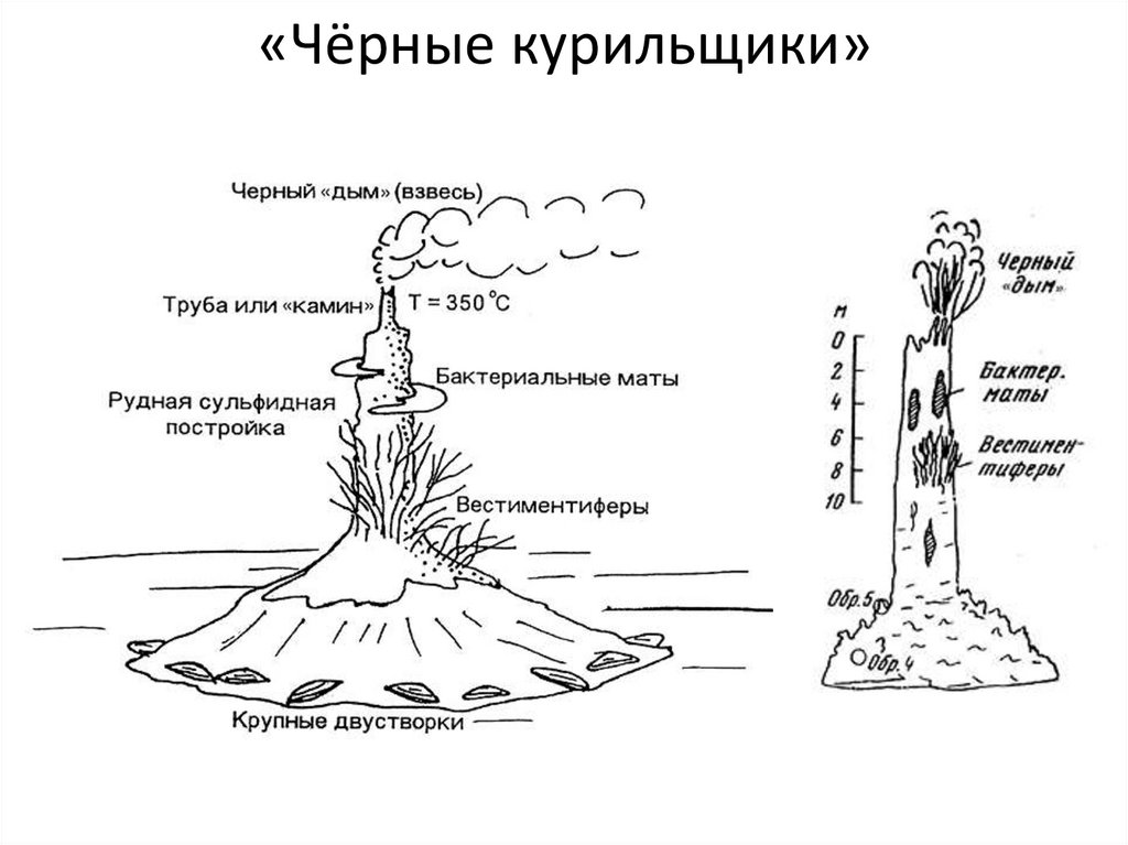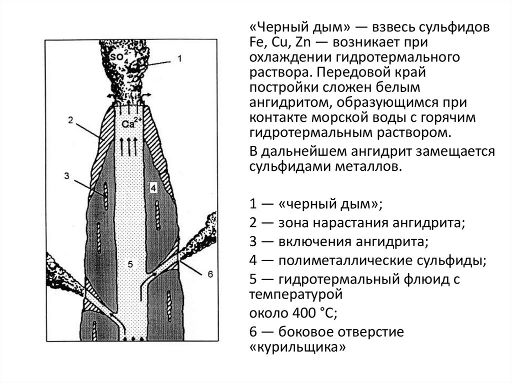 «Черный дым» — взвесь сульфидовFe, Cu, Zn — возникает при