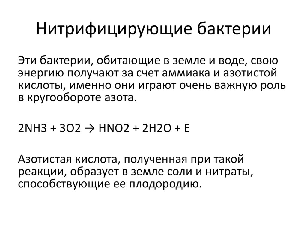 Нитрифицирующие бактерииЭти бактерии, обитающие в земле и воде, свою