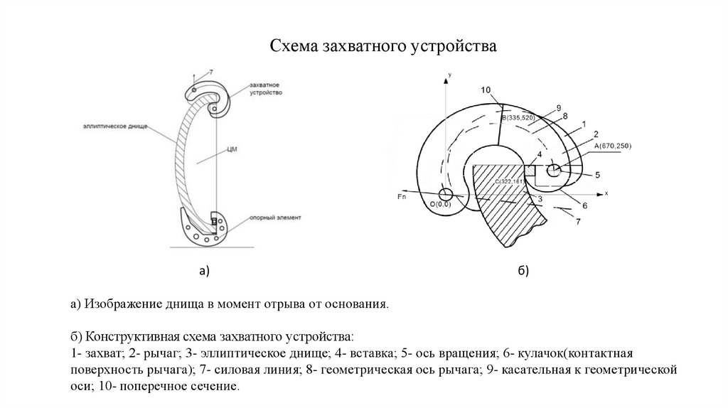 1- захват; 2- рычаг; 3- эллиптическое днище; 4- вставка; 5- ось вращения; 6- кулачок(контактная