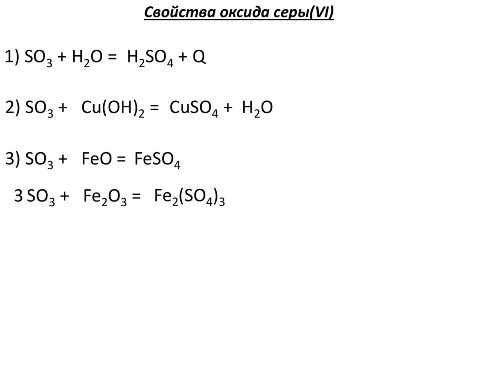 Свойства оксида серы(VI)1) SO3 + H2O = H2SO4 + Q