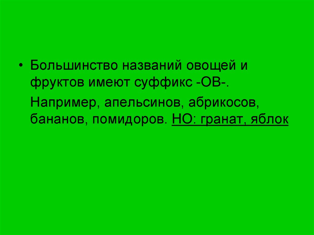 • Большинство названий овощей ифруктов имеют суффикс -ОВ-.