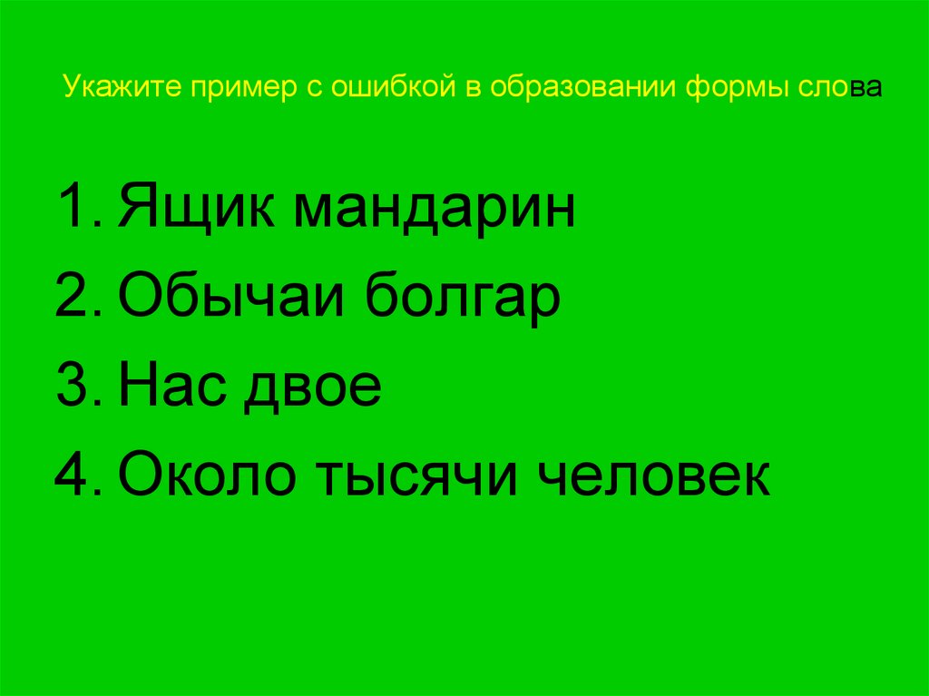 Укажите пример с ошибкой в образовании формы слова1. Ящик мандарин