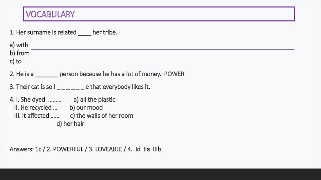 VOCABULARY1. Her surname is related ____ her tribe.