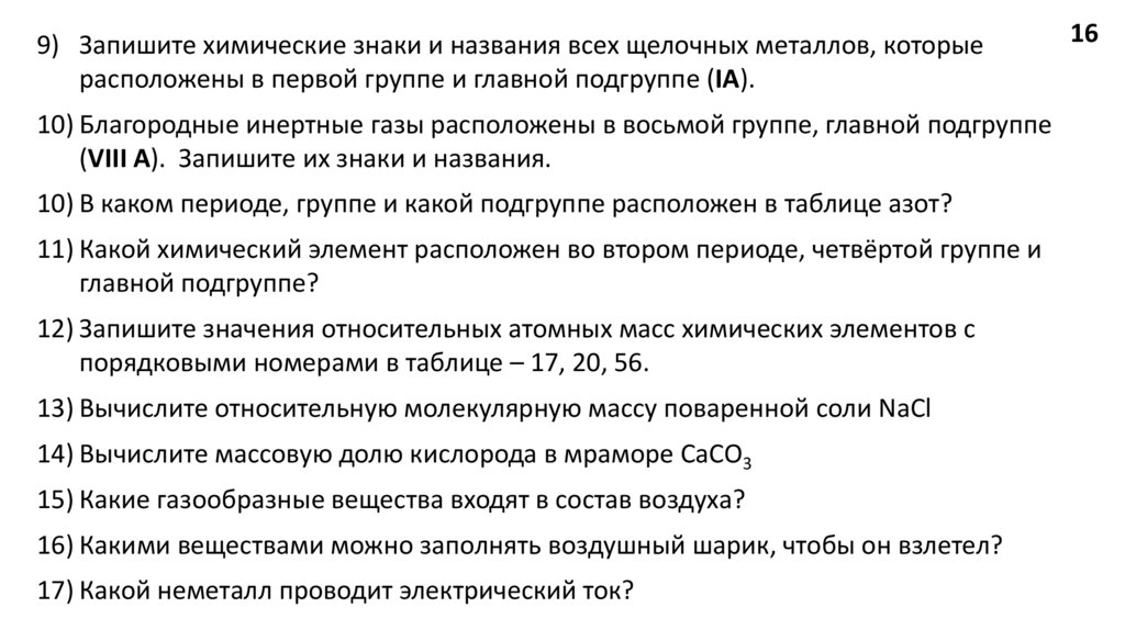 9) Запишите химические знаки и названия всех щелочных металлов, которыерасположены в первой группе и главной подгруппе (IА).