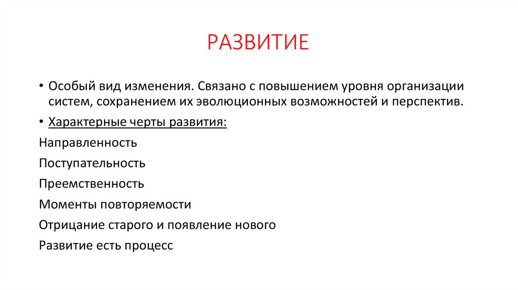 РАЗВИТИЕ• Особый вид изменения. Связано с повышением уровня организации