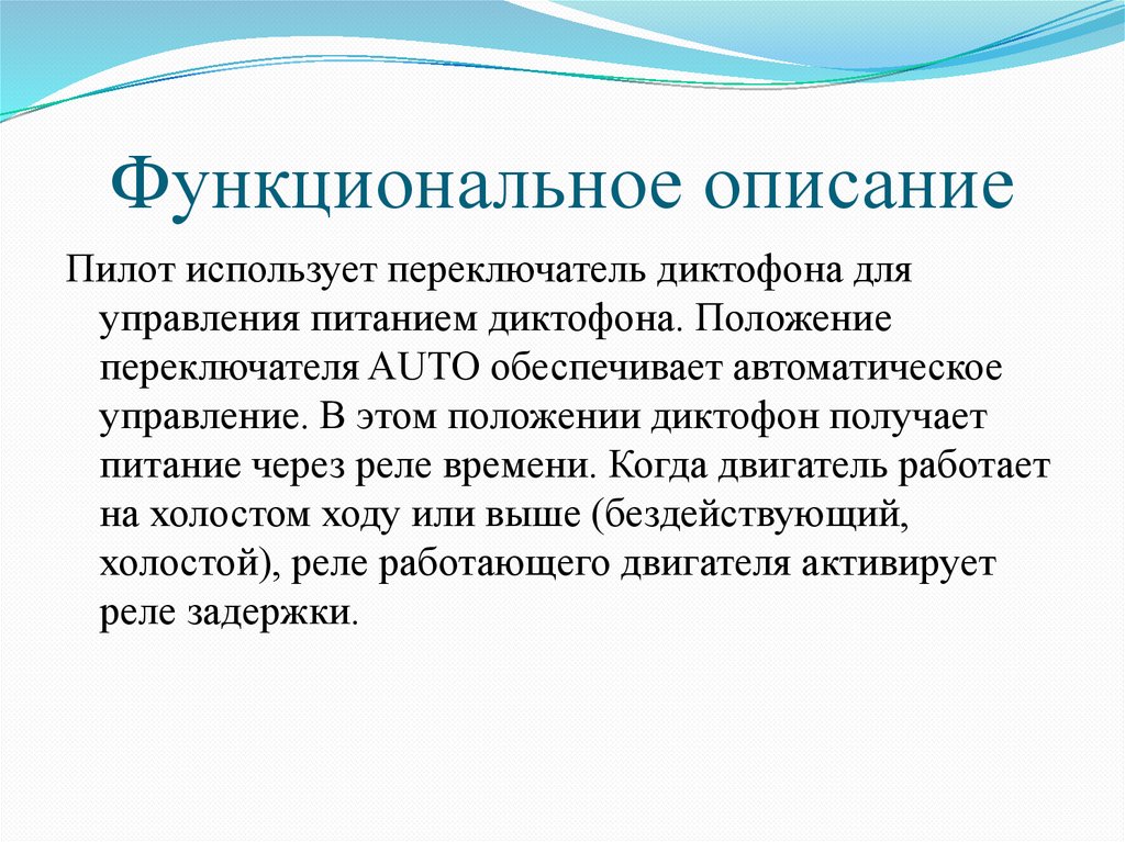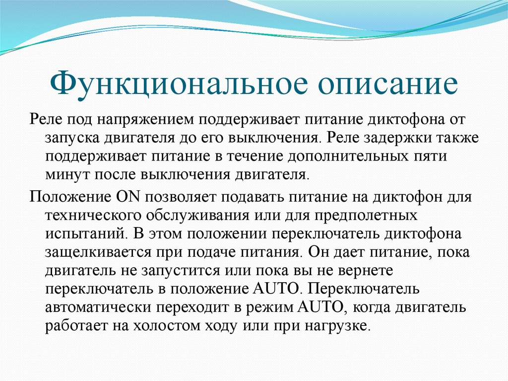 Функциональное описаниеРеле под напряжением поддерживает питание диктофона от