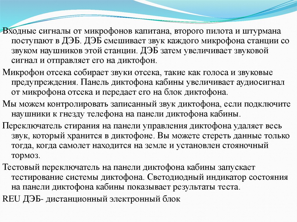 Входные сигналы от микрофонов капитана, второго пилота и штурманапоступают в ДЭБ. ДЭБ смешивает звук каждого микрофона станции со