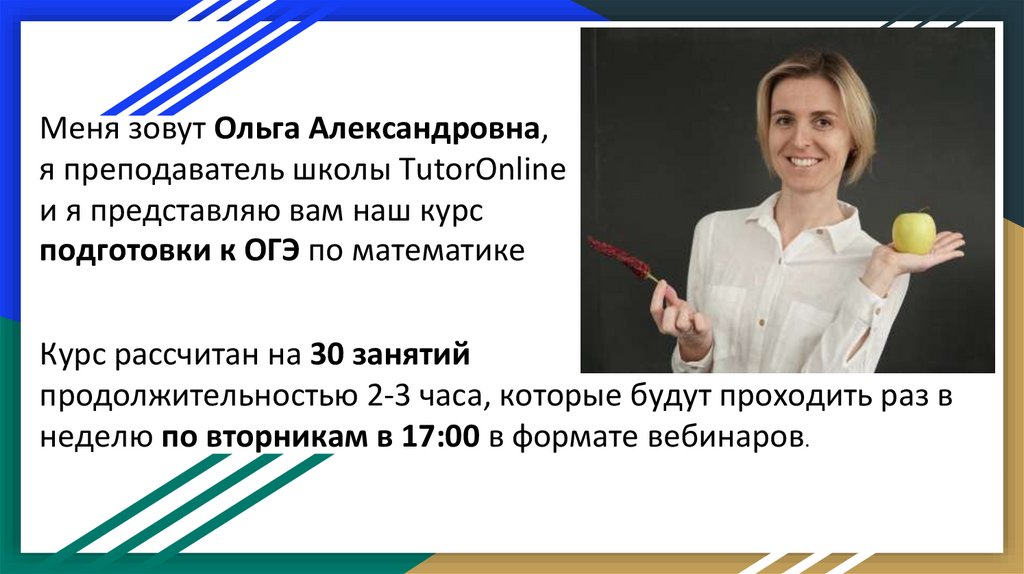 Меня зовут Ольга Александровна,я преподаватель школы TutorOnline