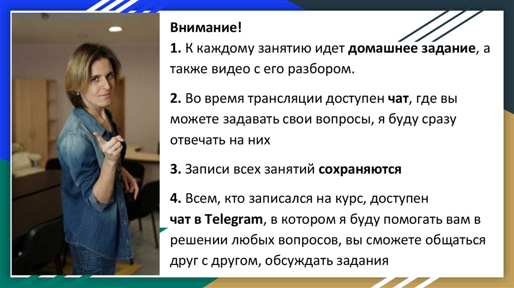 Внимание!1. К каждому занятию идет домашнее задание, а
