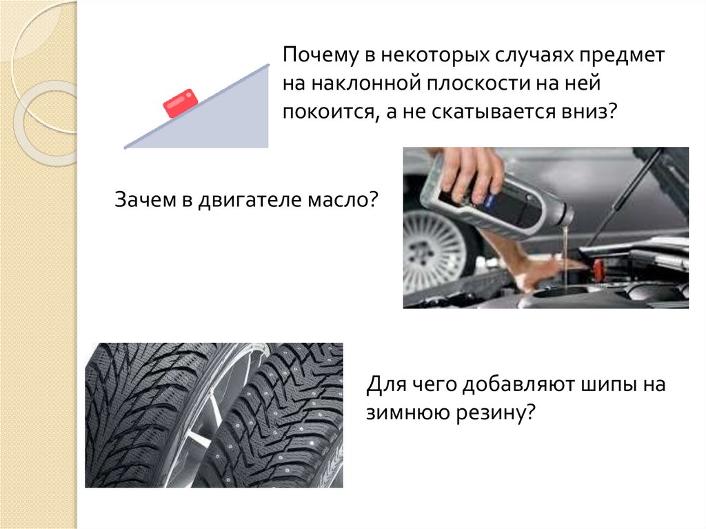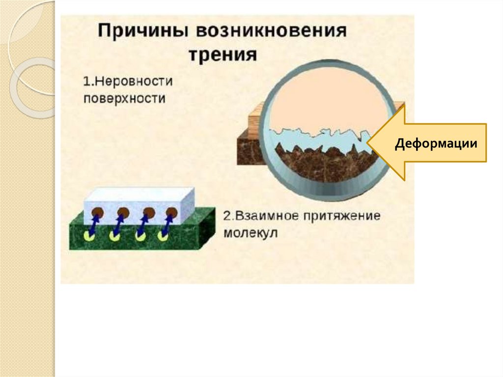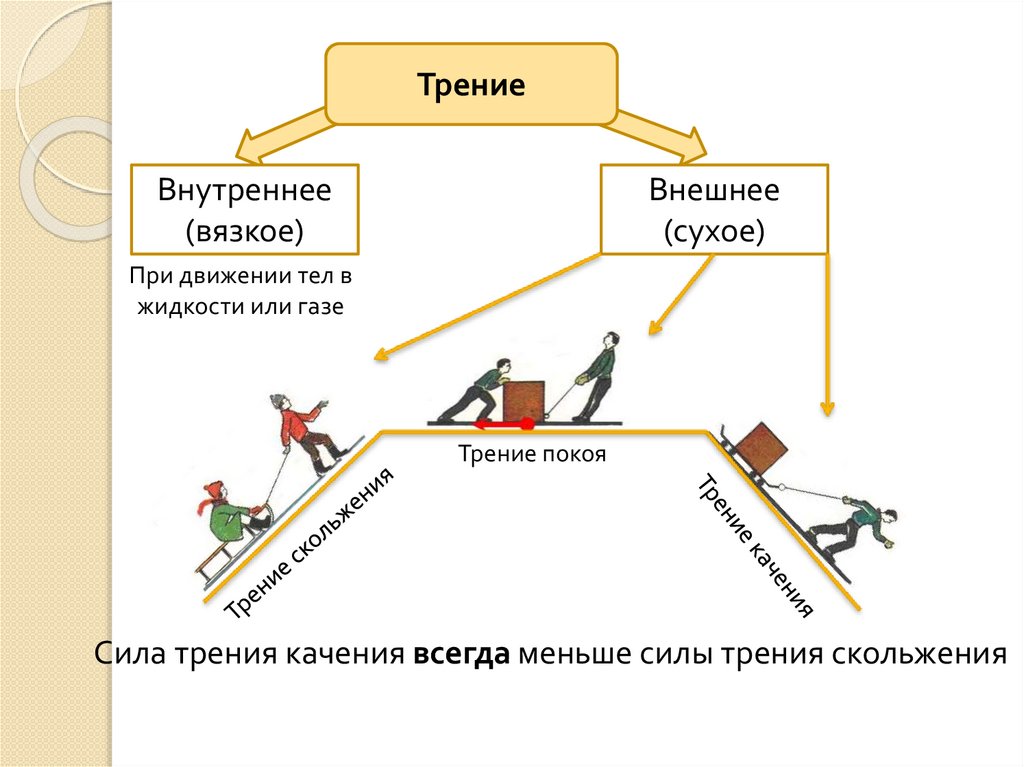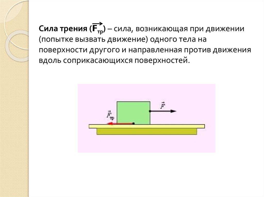 Сила трения (Fтр) – сила, возникающая при движении(попытке вызвать движение) одного тела на