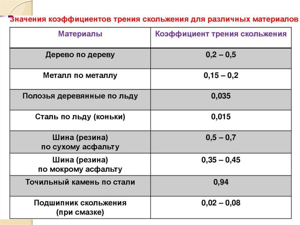Коэффициент трения зависит от материала исостояния соприкасающихся поверхностей двух тел.