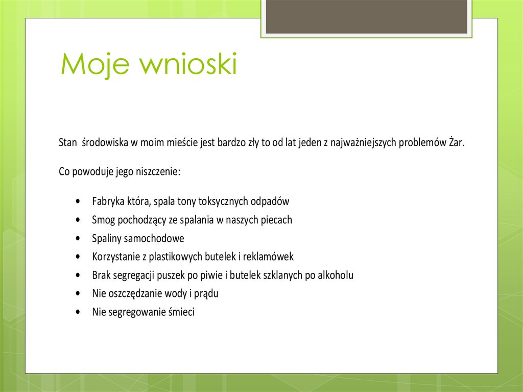 Moje wnioskiStan środowiska w moim mieście jest bardzo zły to od lat jeden z najważniejszych problemów Żar.