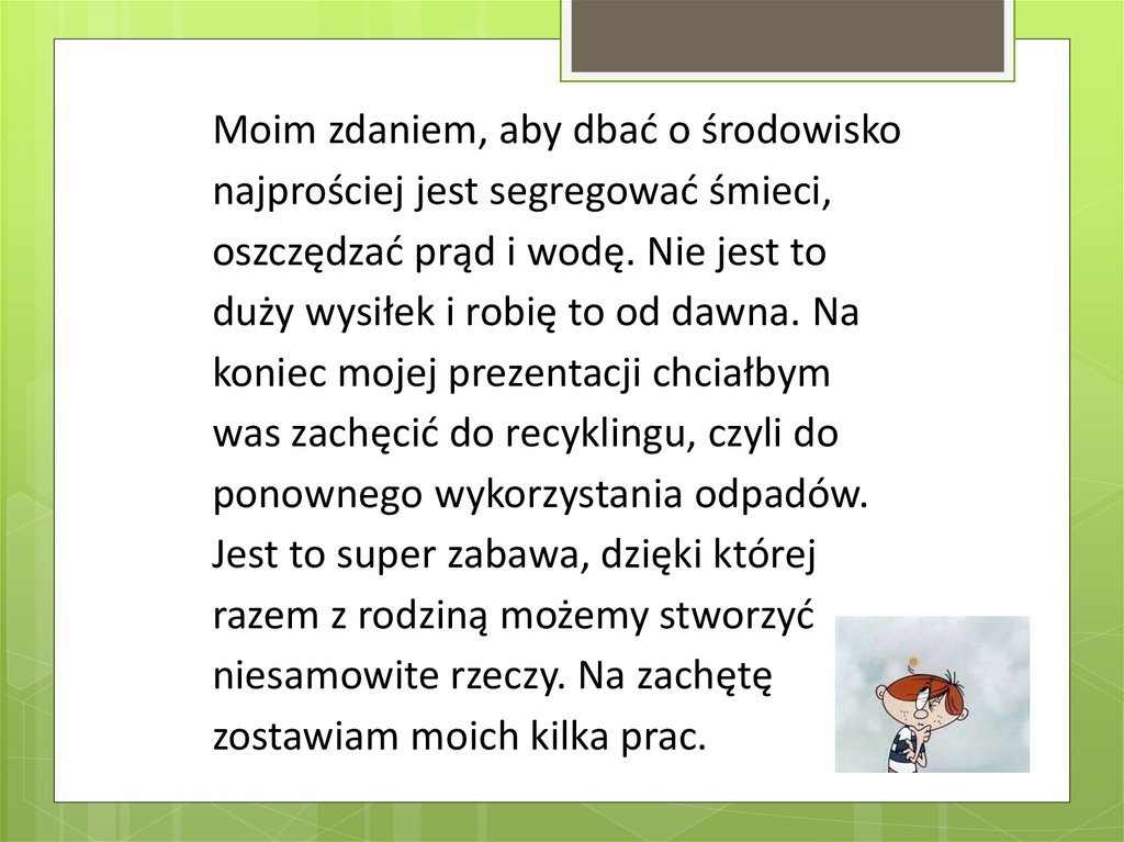 Moim zdaniem, aby dbać o środowiskonajprościej jest segregować śmieci,