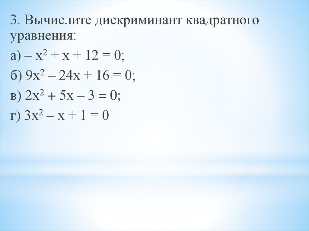3. Вычислите дискриминант квадратногоуравнения: