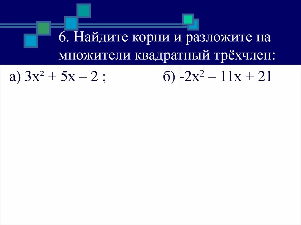 6. Найдите корни и разложите намножители квадратный трёхчлен:
