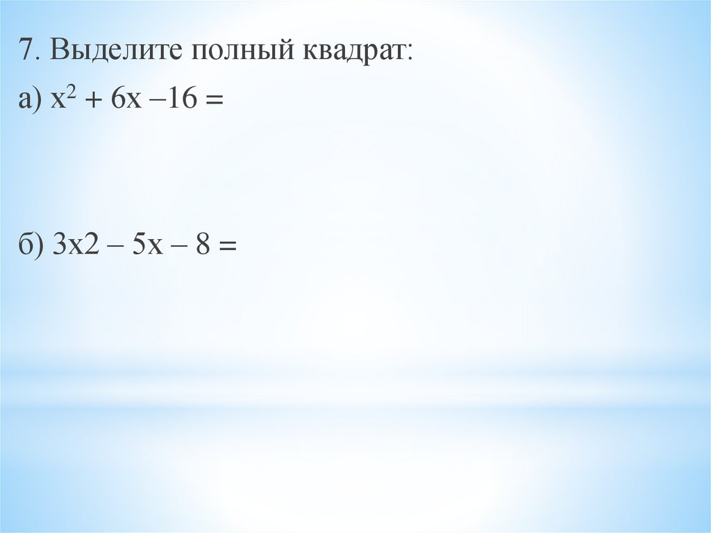 7. Выделите полный квадрат:а) х2 + 6х –16 =