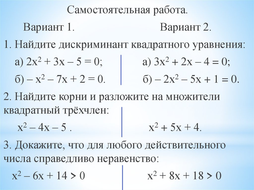 1. Найдите дискриминант квадратного уравнения: