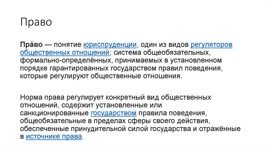 ПравоПра́во — понятие юриспруденции, один из видов регуляторов