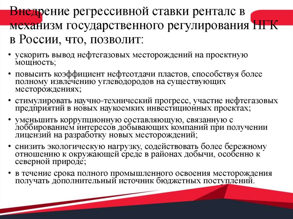 Внедрение регрессивной ставки ренталс вмеханизм государственного регулирования НГК