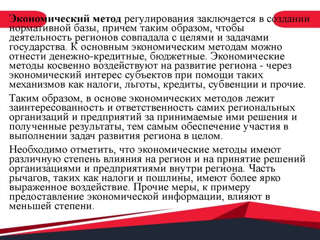 Экономический метод регулирования заключается в созданиинормативной базы, причем таким образом, чтобы