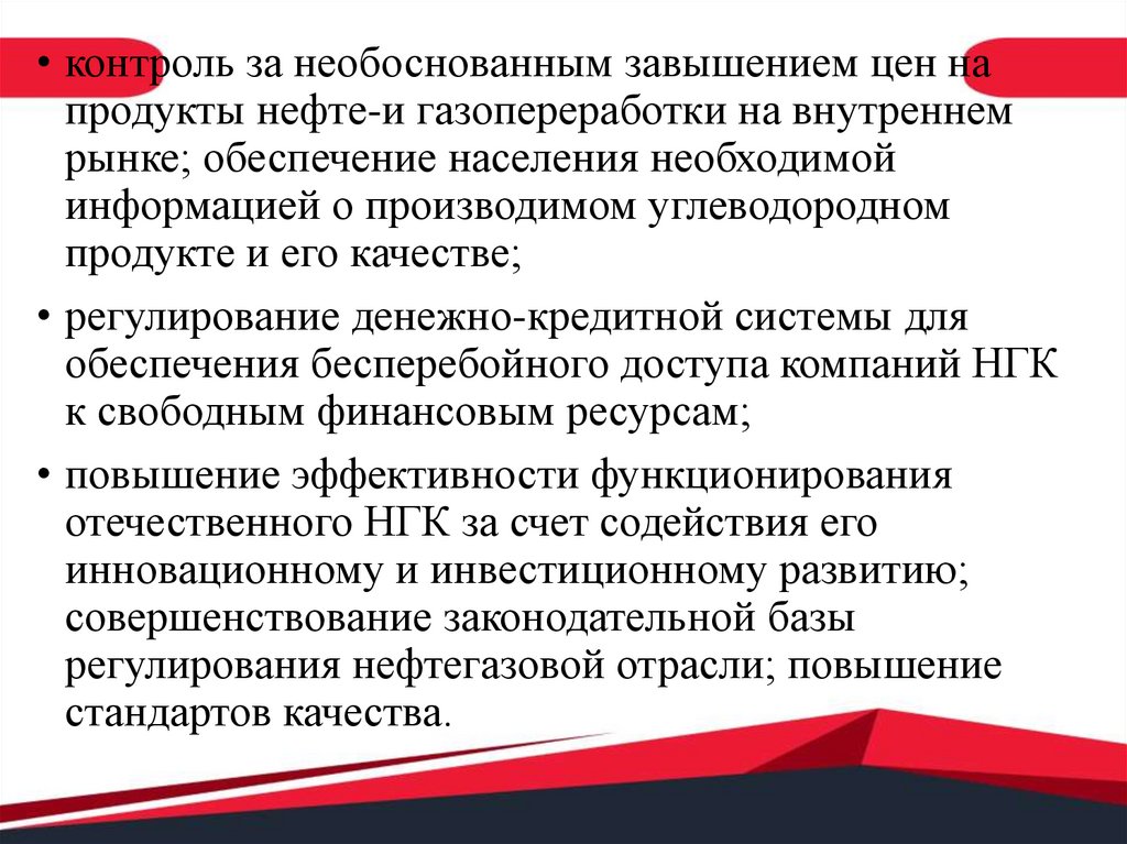 • контроль за необоснованным завышением цен напродукты нефте-и газопереработки на внутреннем