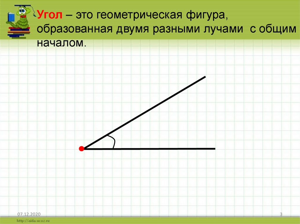 Угол – это геометрическая фигура,образованная двумя разными лучами с общим