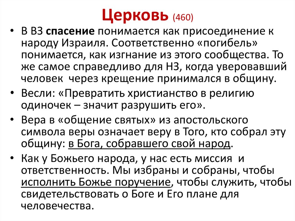 Церковь (460)• В ВЗ спасение понимается как присоединение к